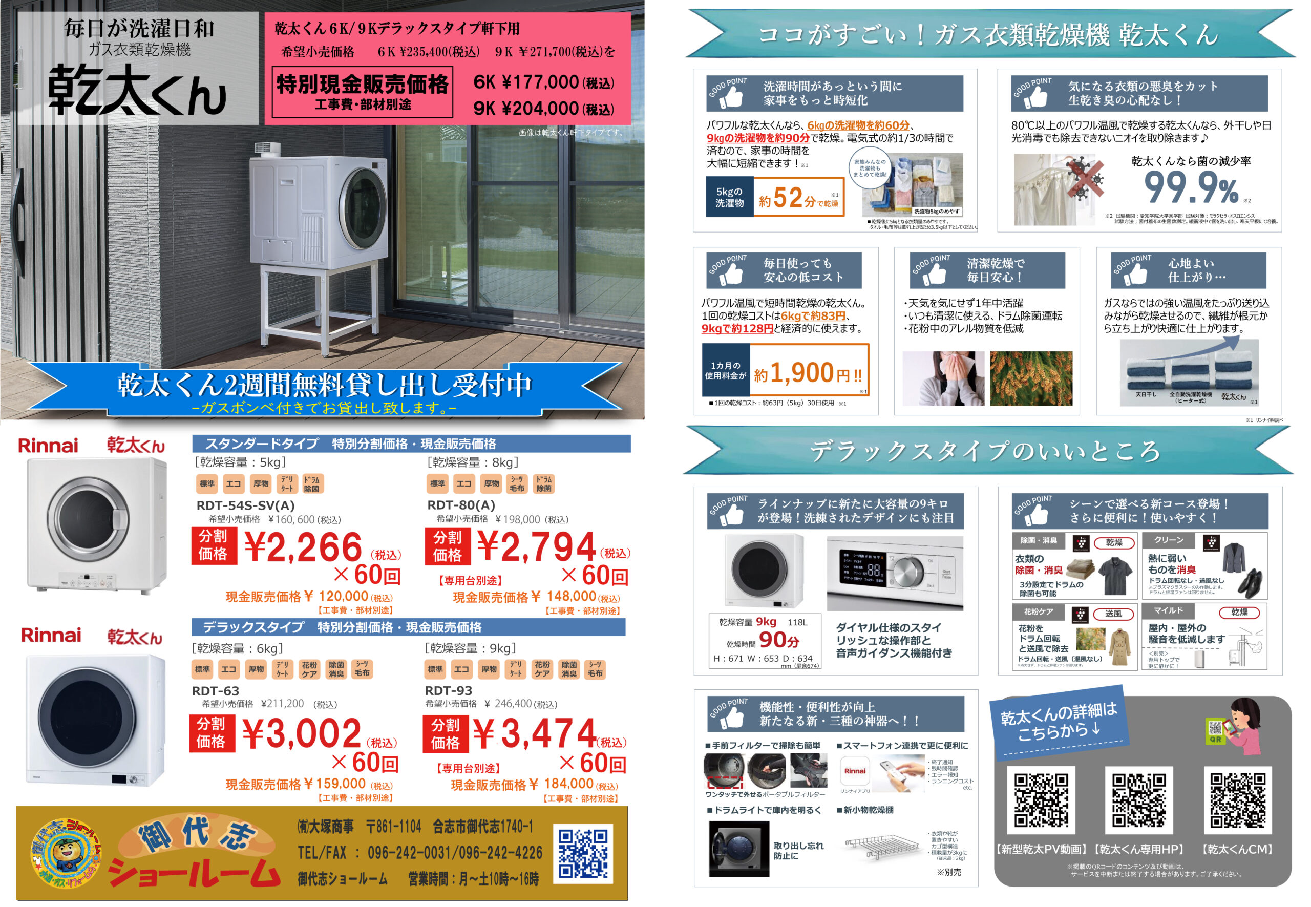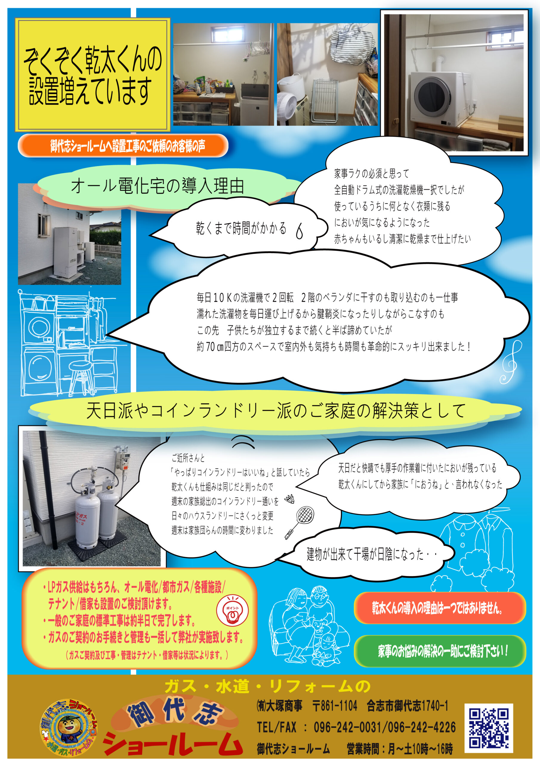 衣類乾燥機乾太くんです!大塚商事では、時短=コスト削減=生活のゆとりを生活家電からご提案致します。