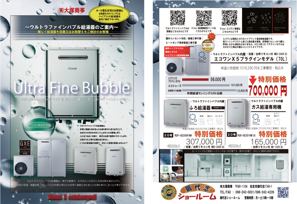 (アーカイブ)2024年~2025年 季節ごとにご案内したキャンペーンチラシです。取扱商品のご相談はお気軽に!! 2025年1月30日 最終更新日時 : 2026年4月1日 ootsuka バスタイムキャンペーン バスタイムキャンペーン 価格改定前のパーパス製給湯器 価格改定前のエコワン情報 価格改定前の乾太くん情報 価格改定前の乾太くん情報 春のトイレフェアー 春のトイレフェアー Follow me!(工事中) FacebookXHatenaPocketCopy