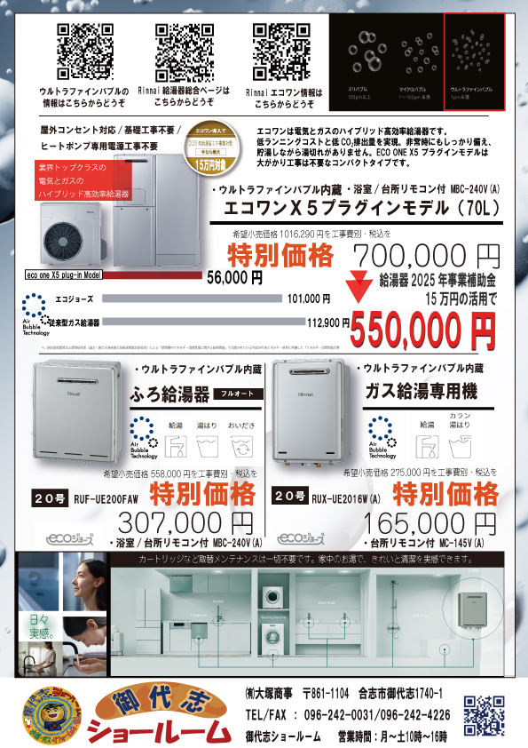 そのほかのガス給湯機器も特別価格でご案内致します。お気軽に御代志ショールームにお問い合わせ下さいませ❗